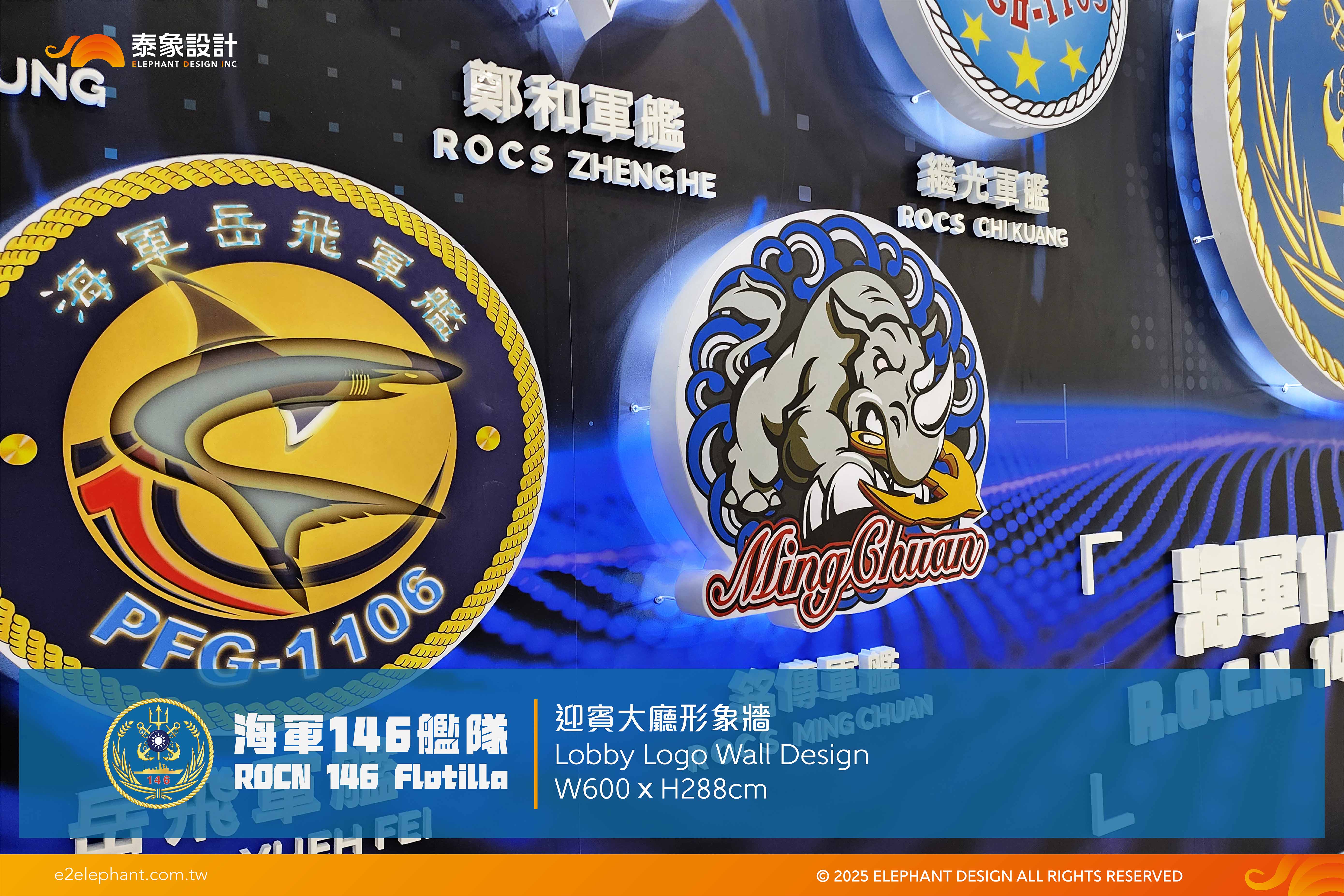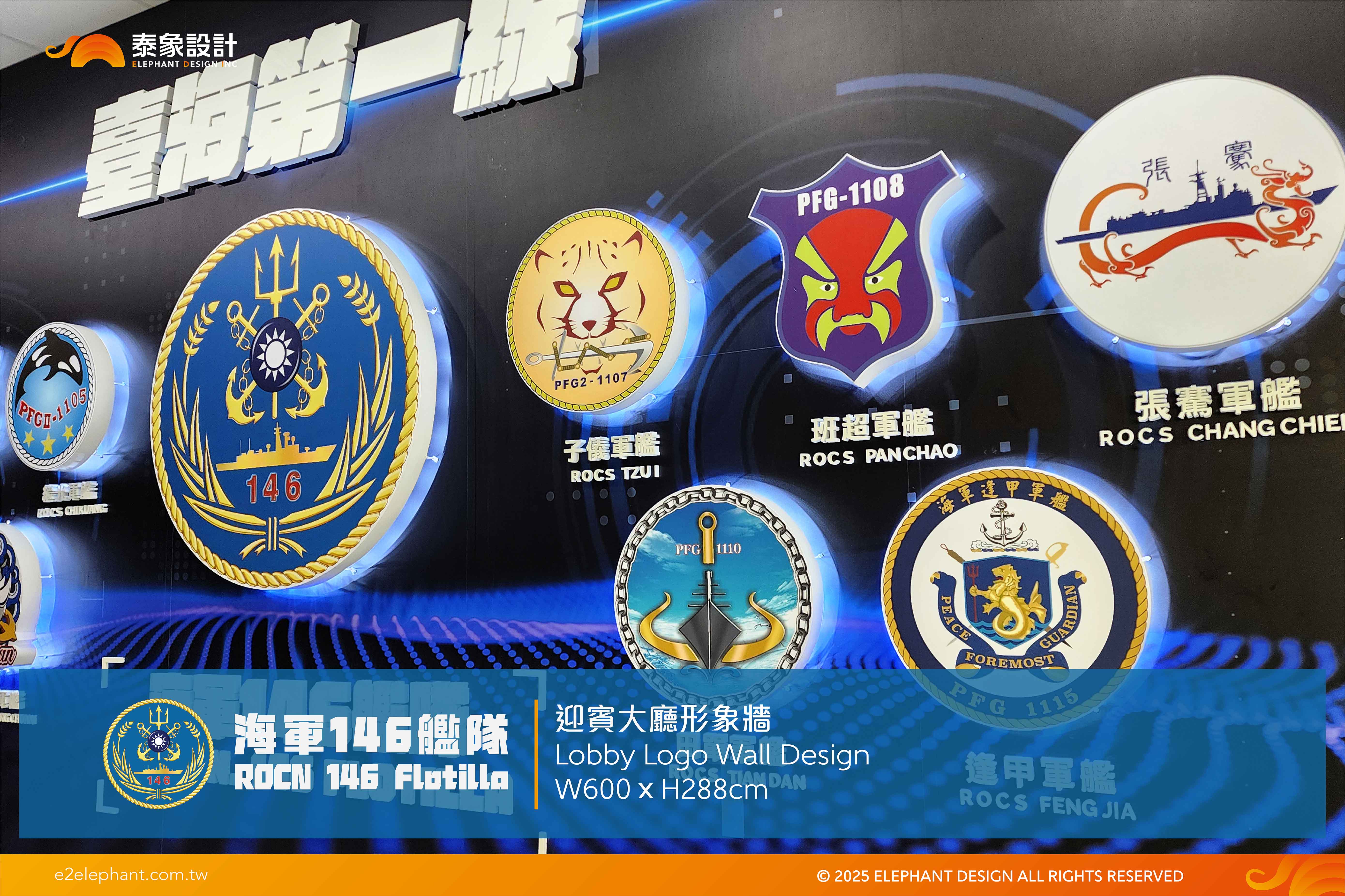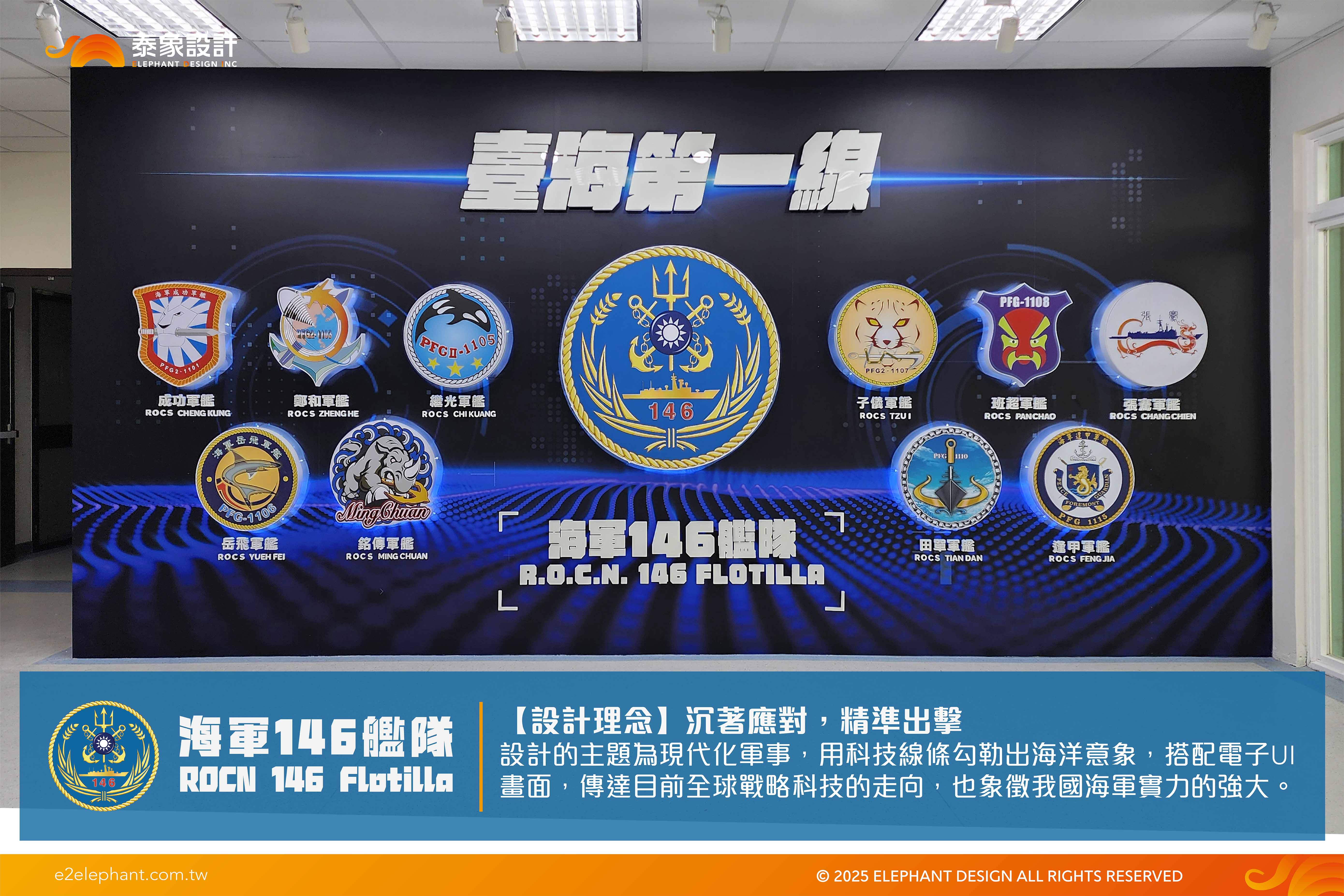 設計的主題為現代化軍事,用科技線條勾勒出海洋意象,搭配電子UI畫面,傳達目前全球戰略科技的走向,也象徵我國海軍實力的強大。