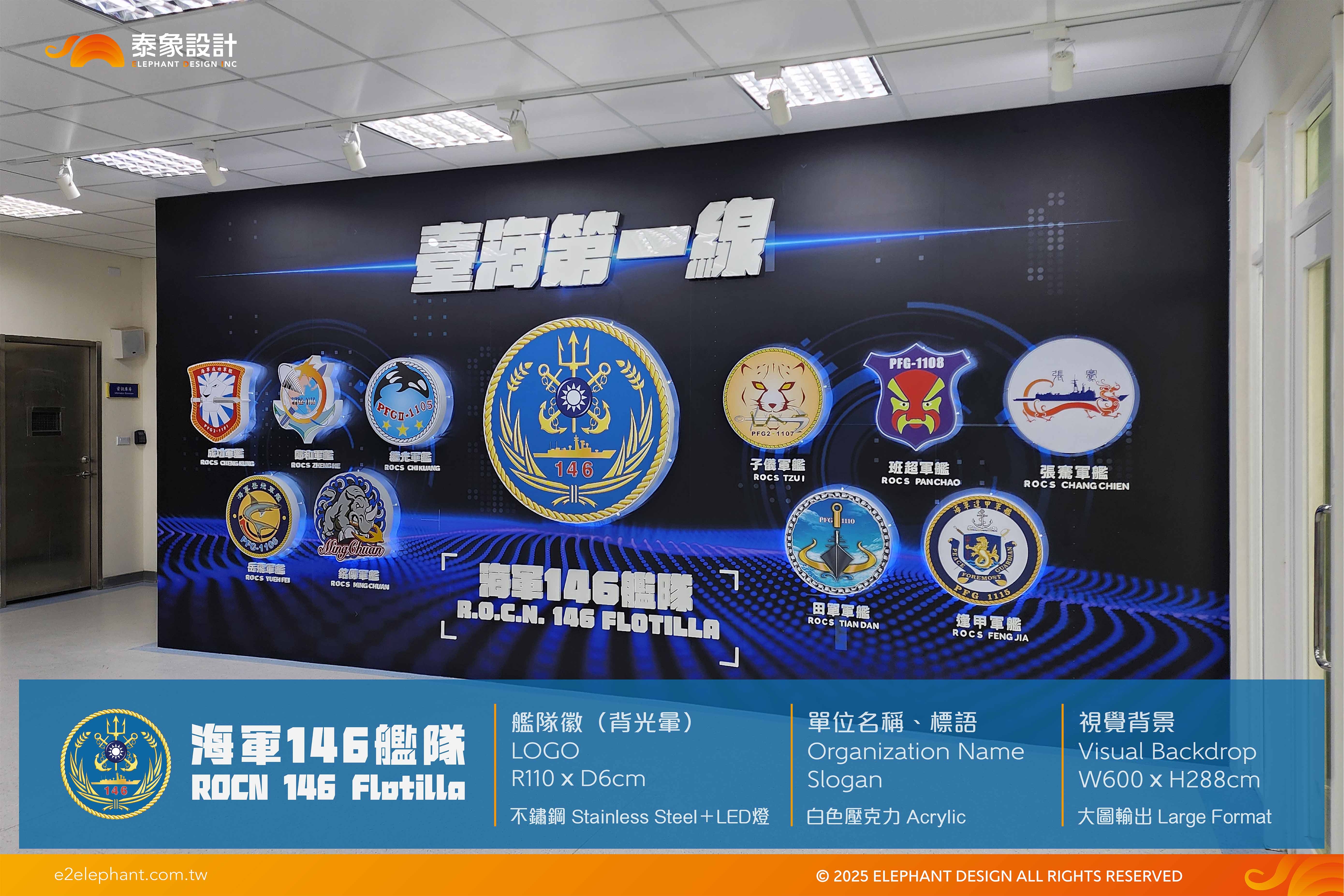 使用建材:結構木作、金屬隊徽LOGO(發光)、白色壓克力字(中&英文)、LED投射燈(白光)、PVC彩圖輸出