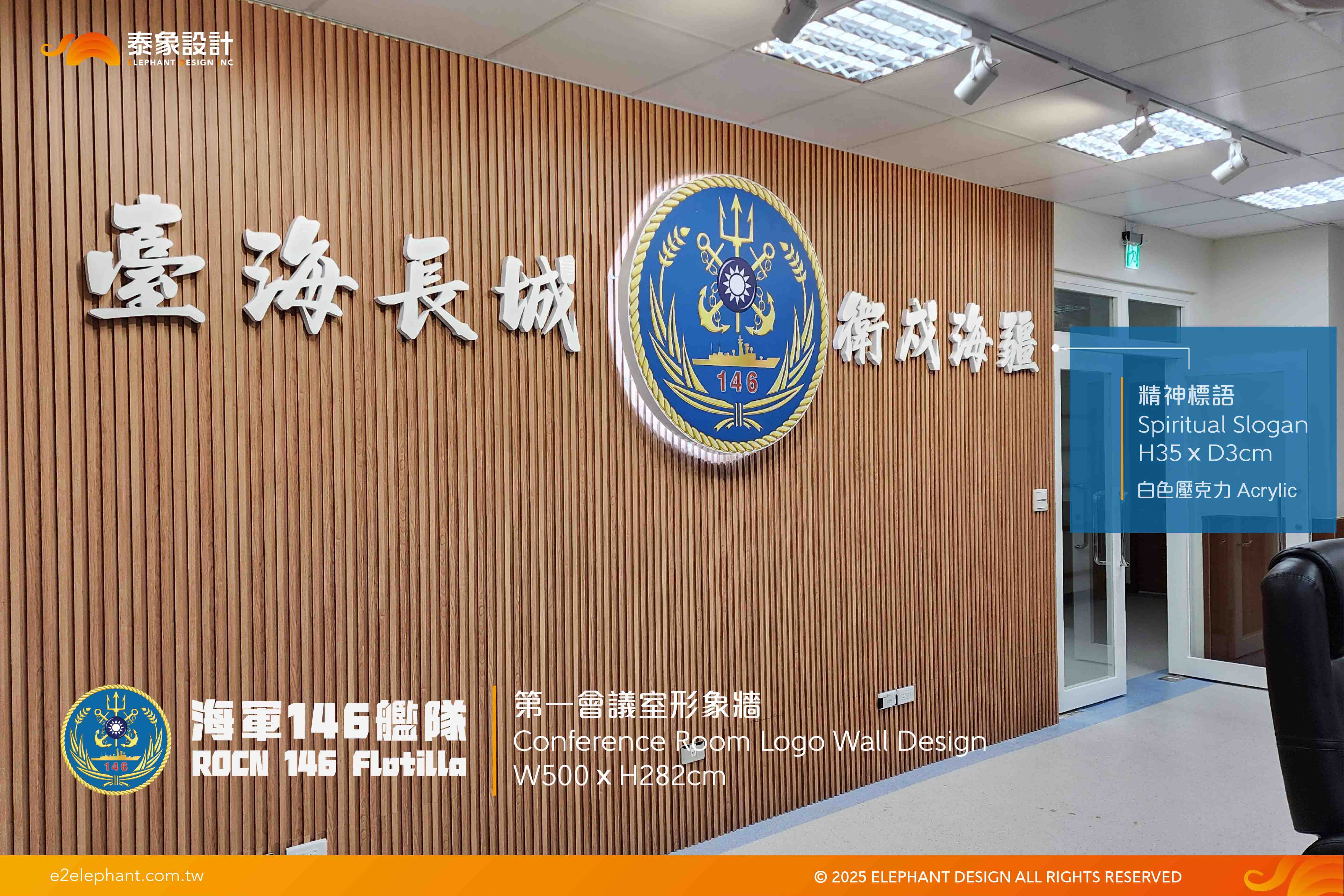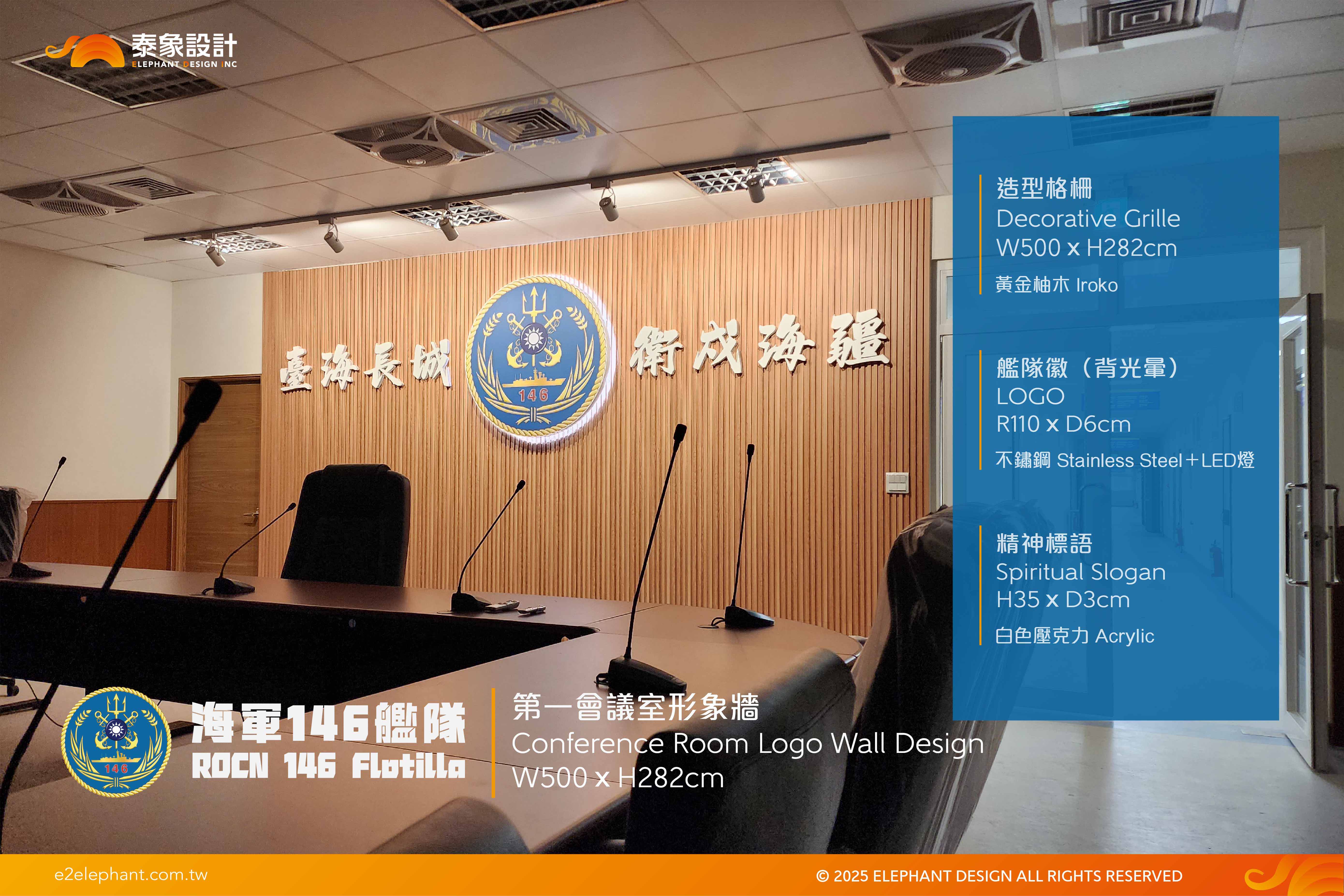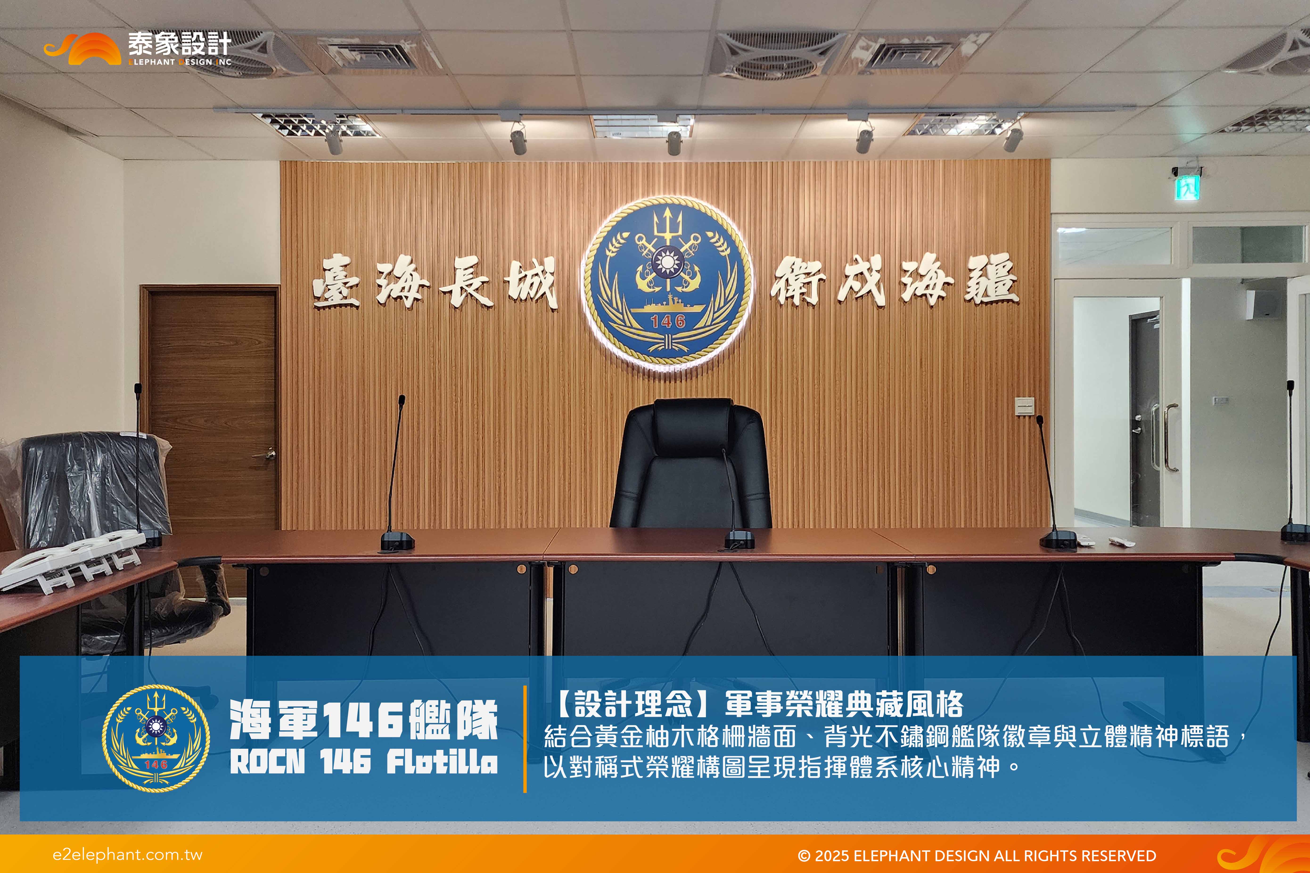 設計走「軍事榮耀」風格,結合黃金柚木格柵牆面、背光不鏽鋼艦隊徽章與立體精神標語,以對稱式榮耀構圖呈現指揮體系核心精神。