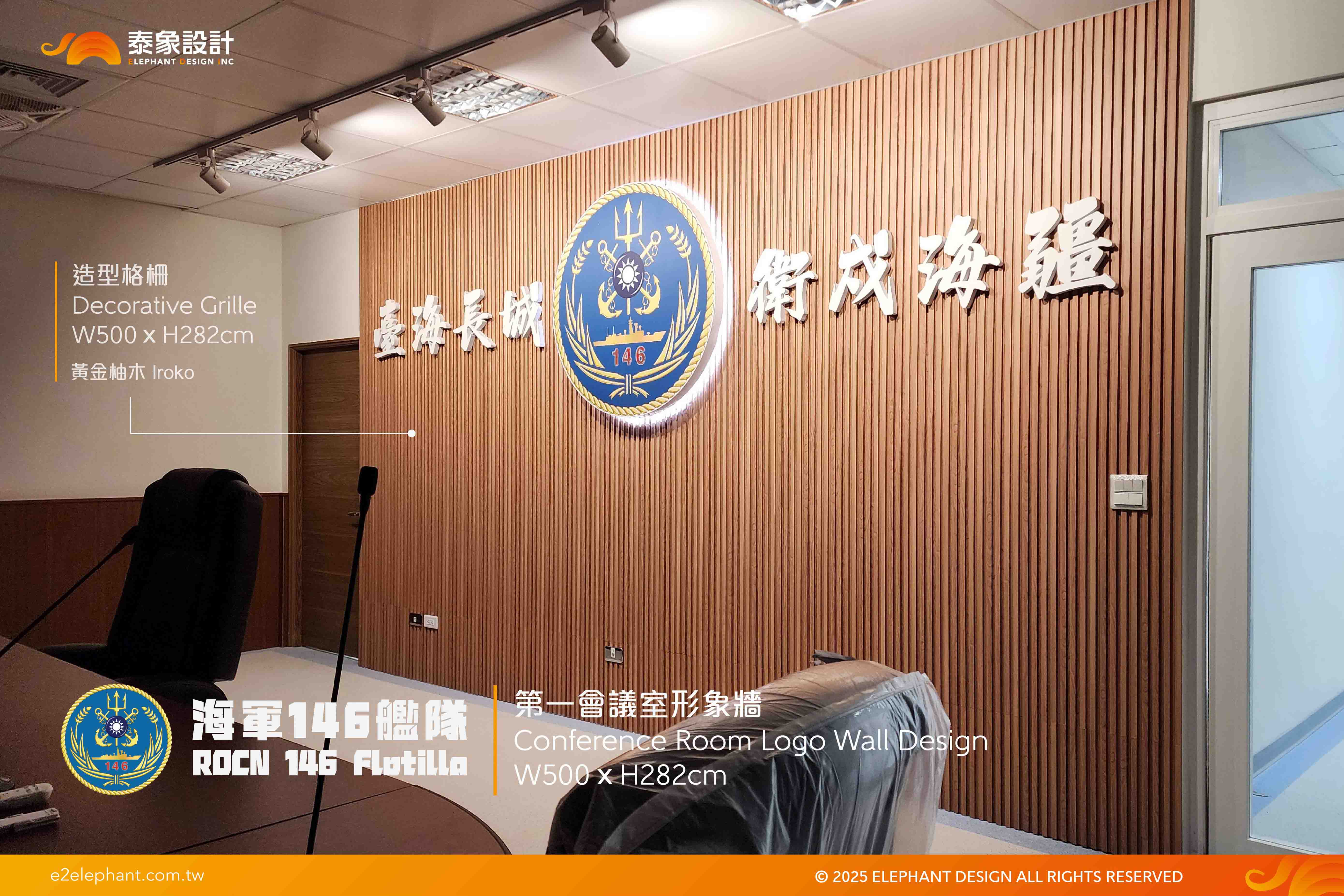 使用建材:格柵板(黃金柚木)、金屬隊徽LOGO(發光)、白色壓克力字(中文)、LED投射燈(白光)